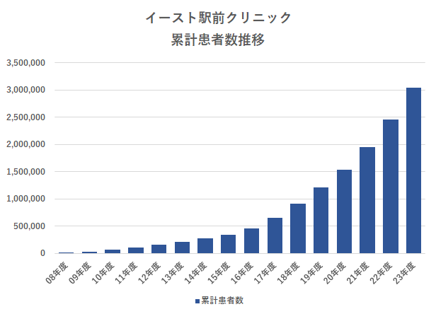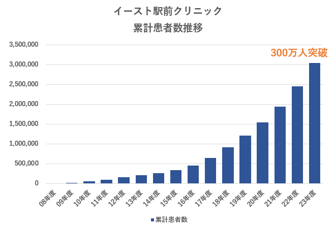 AGA・ED診療を中心にを行う「イースト駅前クリニック」は、2008年の開院から全国駅近を中心にクリニック数を増やしてきました。その結果多くの患者様にご来院いただき、2008年9月の開院から2024年3月末をもちまして、累計診療実績300万人を突破いたしました。これを記念して、さらに多くの患者様に当院をご利用いただくために、「AGAのりかえ割」を2024年6月10日(月)よりスタートいたします。