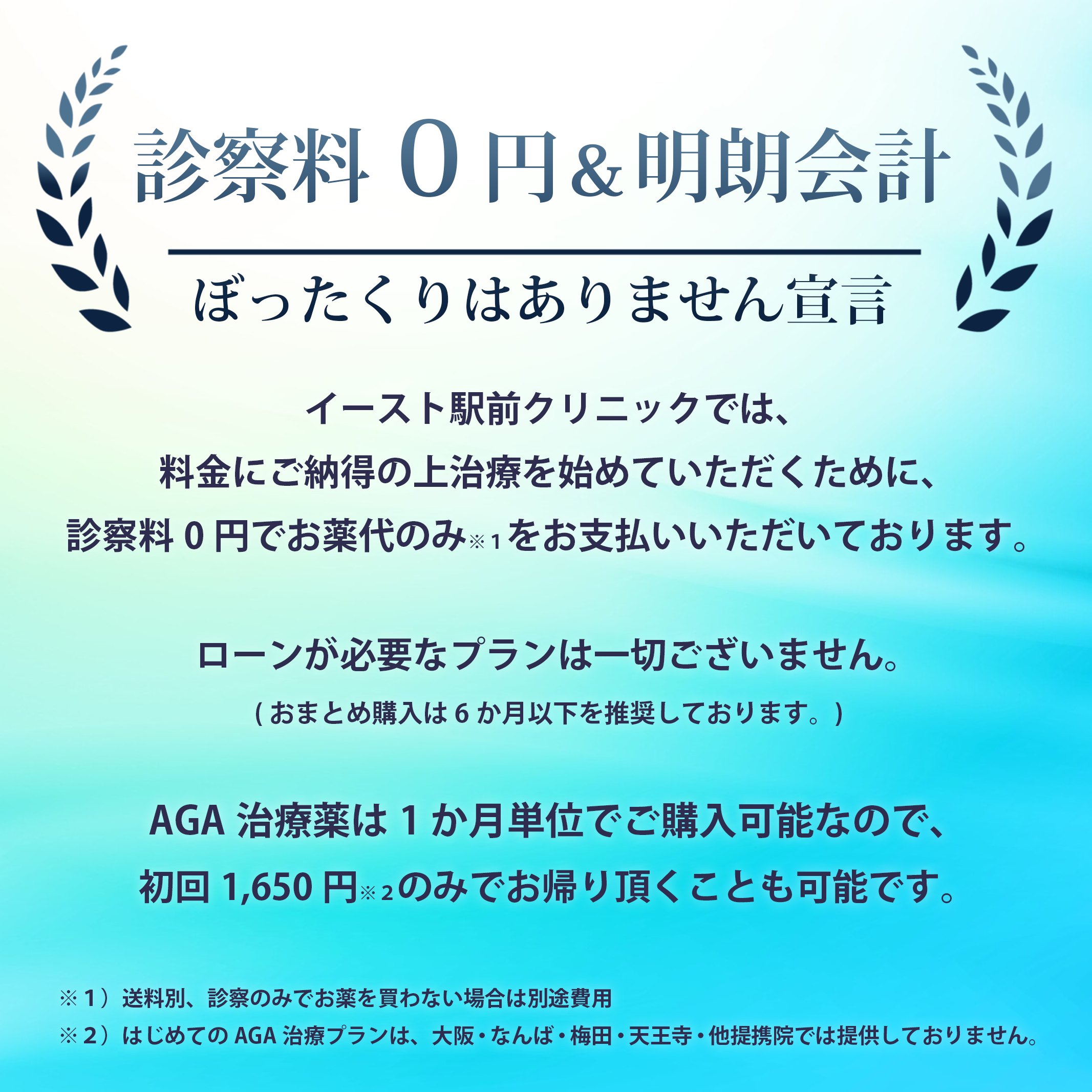 ※3イースト駅前クリニックのAGA治療で高額ローンを組むようなプランはございません。1か月分から購入可能です。