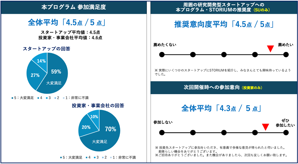 本プログラムには、事前選考を通過した研究開発型スタートアップ22社(27名)および、STORIUMが招聘した投資家・事業会社18社(28名)が参加。25分間の個別1on1面談を全80件実施し、具体的な協業・投資に向けた実践的な対話が展開されました。