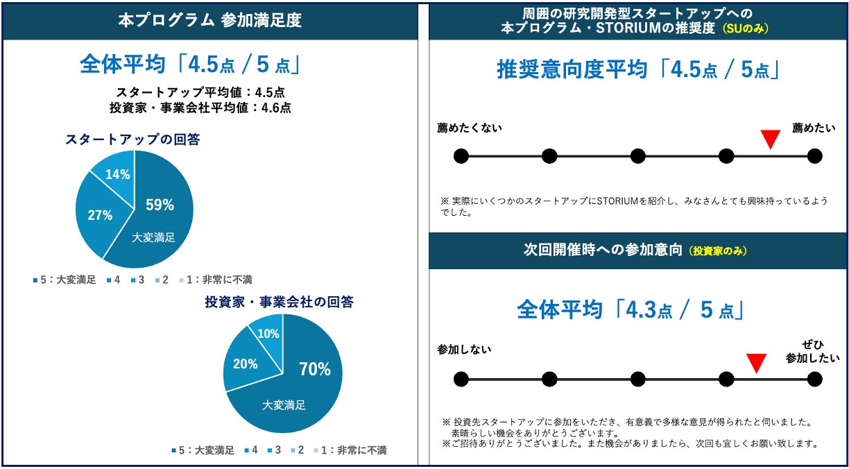 本プログラムは、科学技術の社会実装を加速させる出会いの最適化を目的に、大学発・研究発スタートアップと、CVC・VC・事業会社など資金および事業リソースを有する組織との間で、個別対話を通じた共創・投資・共同研究の機会創出を目指すものです。STORIUMが保有する全国800社超のスタートアップデータベースと独自のマッチング設計をもとに選定されたAI、バイオ、クリーンテック、量子、マテリアル、医療など多様な分野の精鋭スタートアップが、最先端技術の社会実装を志向する事業会社や投資家と1on1面談を実施。将来的な資金調達や事業連携に向けた具体的な協議が活発に行われ、会場全体が大きな熱量に包まれました。