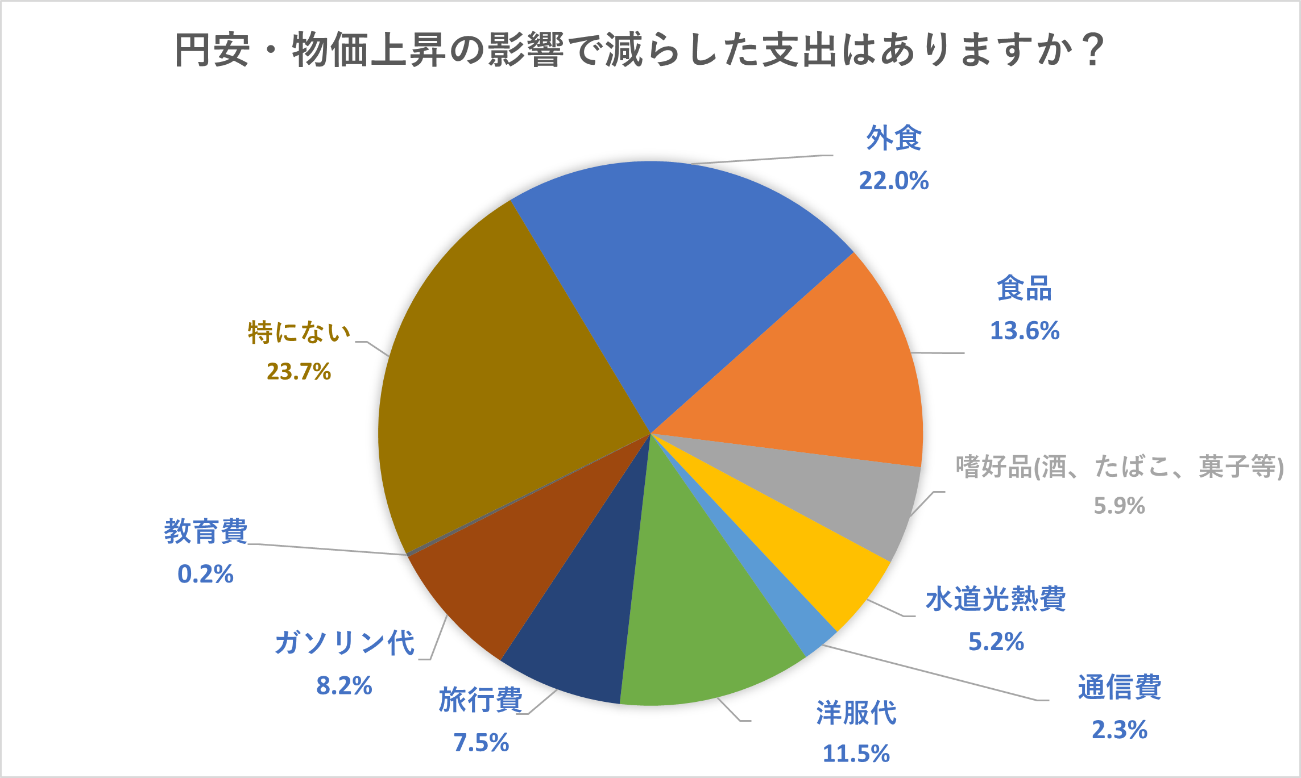 円安・物価上昇の影響で減らした支出について「特にない」が1番多くの回答となっており、