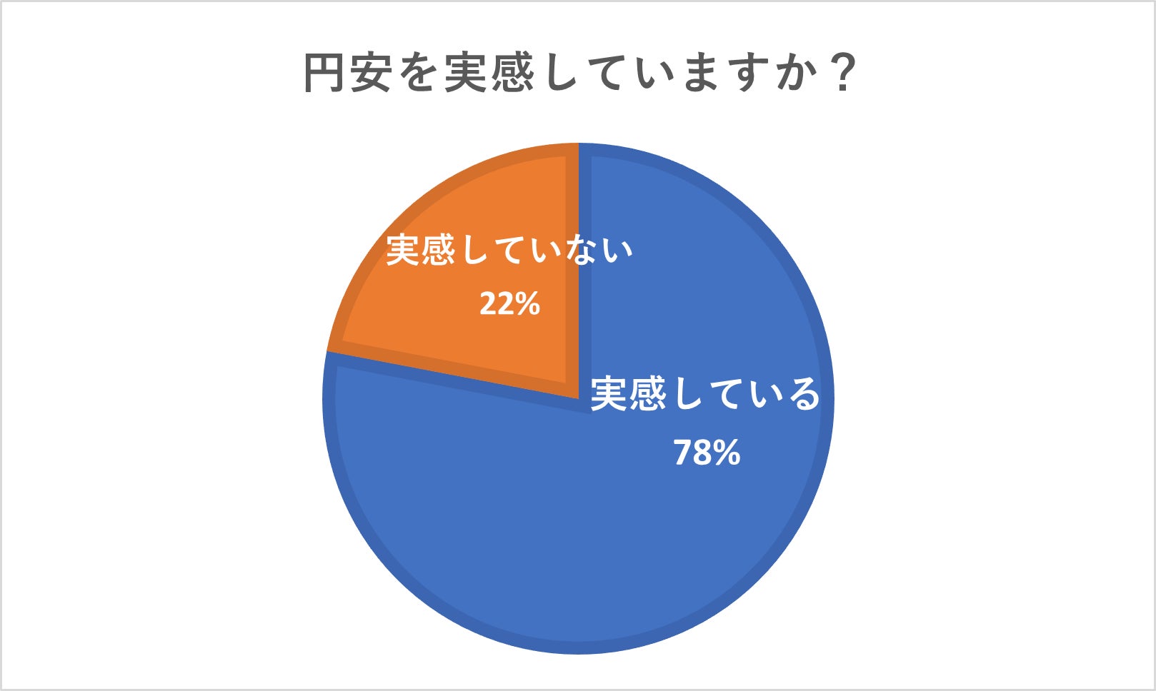 78%の方が「実感している」と回答し、全体の8割近くの方が、円安を実感していることがわかります。