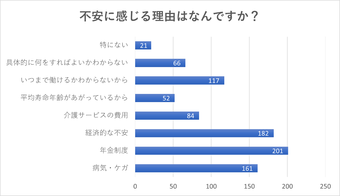 多かった回答は「年金制度」「経済的な不安」「病気・ケガ」でした。