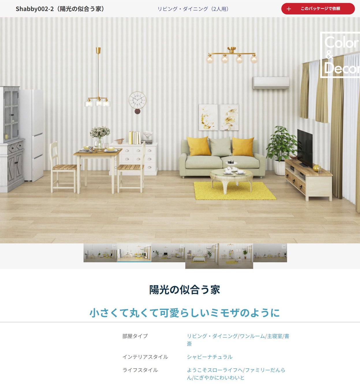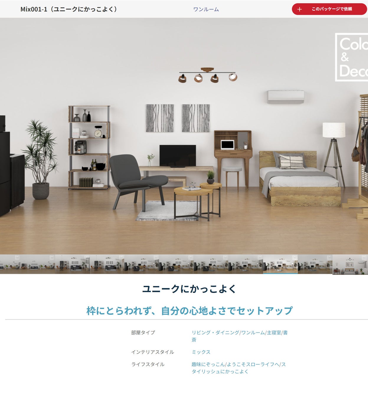 インテリアコーディネーターがあらかじめ用意した多数のパッケージから、写真に追加するインテリアを選択するだけでお部屋のデザインが完了します。「北欧」「ナチュラル」などインテリアスタイルから選べるだけではなく、「静かなときを楽しむ」「スタイリッシュに」といった住まい方暮らし方のコンセプトから選べるようになりました。