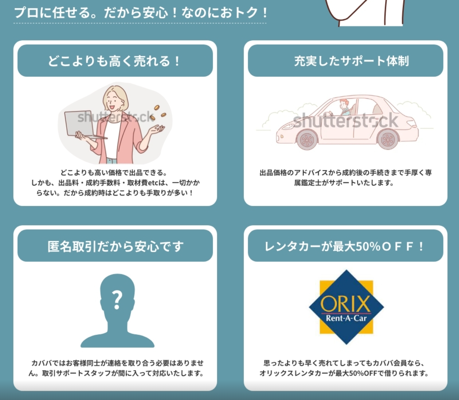 カババでお車を売却した方にアンケート調査を行ったところ、下取や買取査定よりも平均で55万円も高く売れていることがわかりました。しかし、「高く売れたのは良いけれど、思ったよりも早く売れてしまった」と、一部のお客様から次の車が納車されるまでの間レンタカーを借りたいと要望があり、お得に借りられるサービスをオリックス自動車様のご協力をいただき、カババ会員限定のレンタカー優待サービスを提供することとなりました。