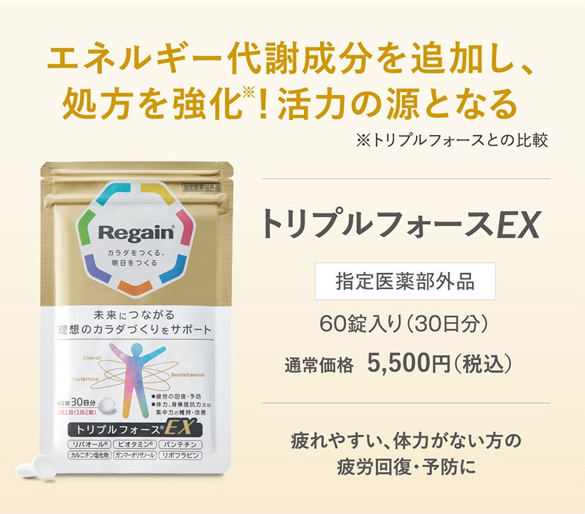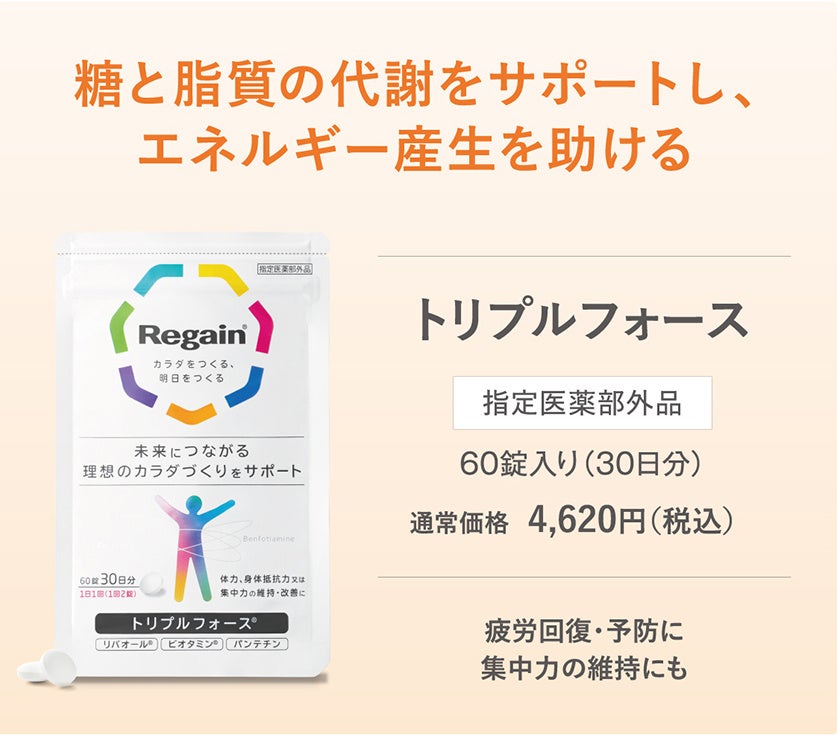 リゲインのブランド名は、「Re(再び)+gain(獲得する)」から、疲れた身体に再びパワーを与え「取り戻す」というメッセージが込められています。