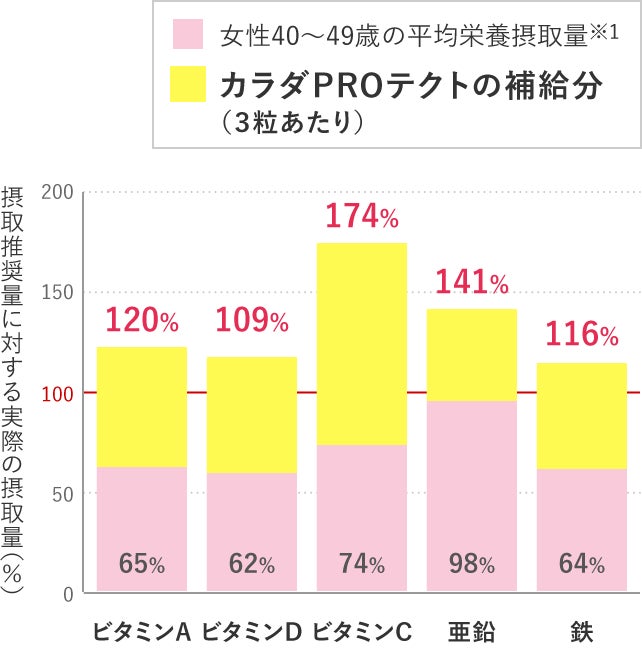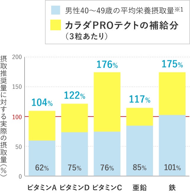 *40~49歳男女の1日あたりの摂取推奨量(厚生労働省「日本人の食事摂取基準(2020年版)」参照)を100%として算出 少数点以下は四捨五入