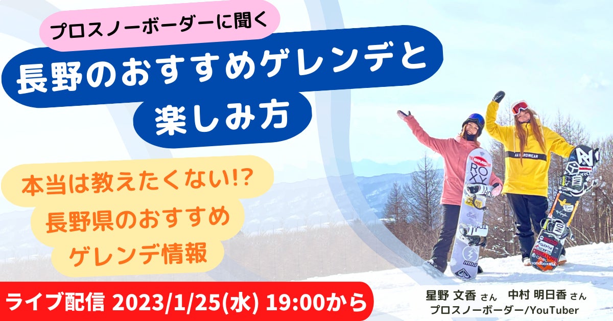 (一社)長野県観光機構は、2023年1月25日(水)に、オンライン配信イベント「プロスノーボーダーに聞く『長野のおすすめのゲレンデと楽しみ方』」をオンライン配信します。