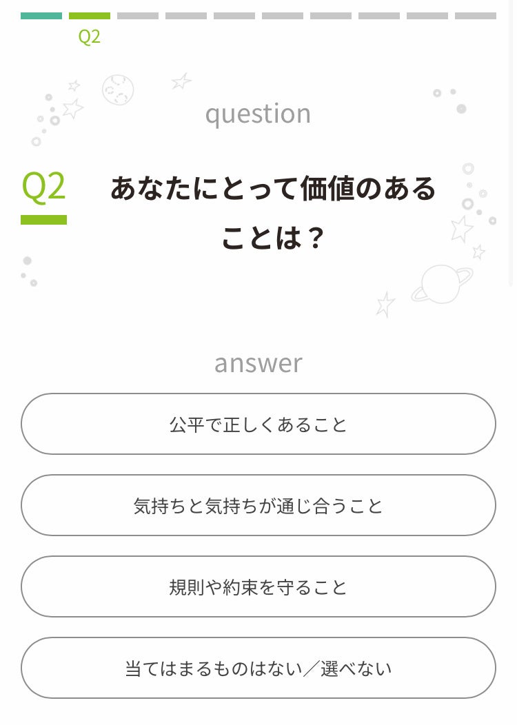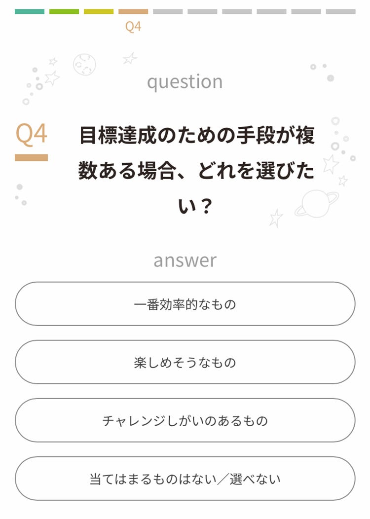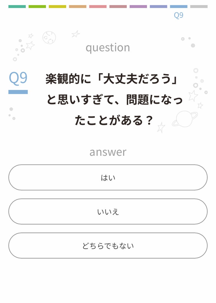 【惑星タイプ性格診断】は、独自の事前アンケート結果をもとに設問を工夫し、簡単に診断できるようにしました。10の質問に直感的に答えていくだけで、性格タイプがわかります。