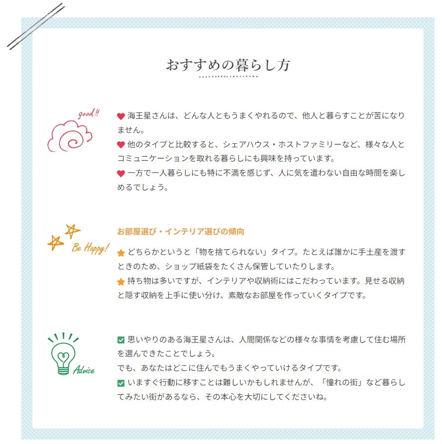 こうした「お部屋の選び方」や「インテリアの傾向」についての独自のアドバイスはもちろん、一般的な性格診断でよく触れられている「適職」や「ストレスへの対処法」のアドバイスもあります。