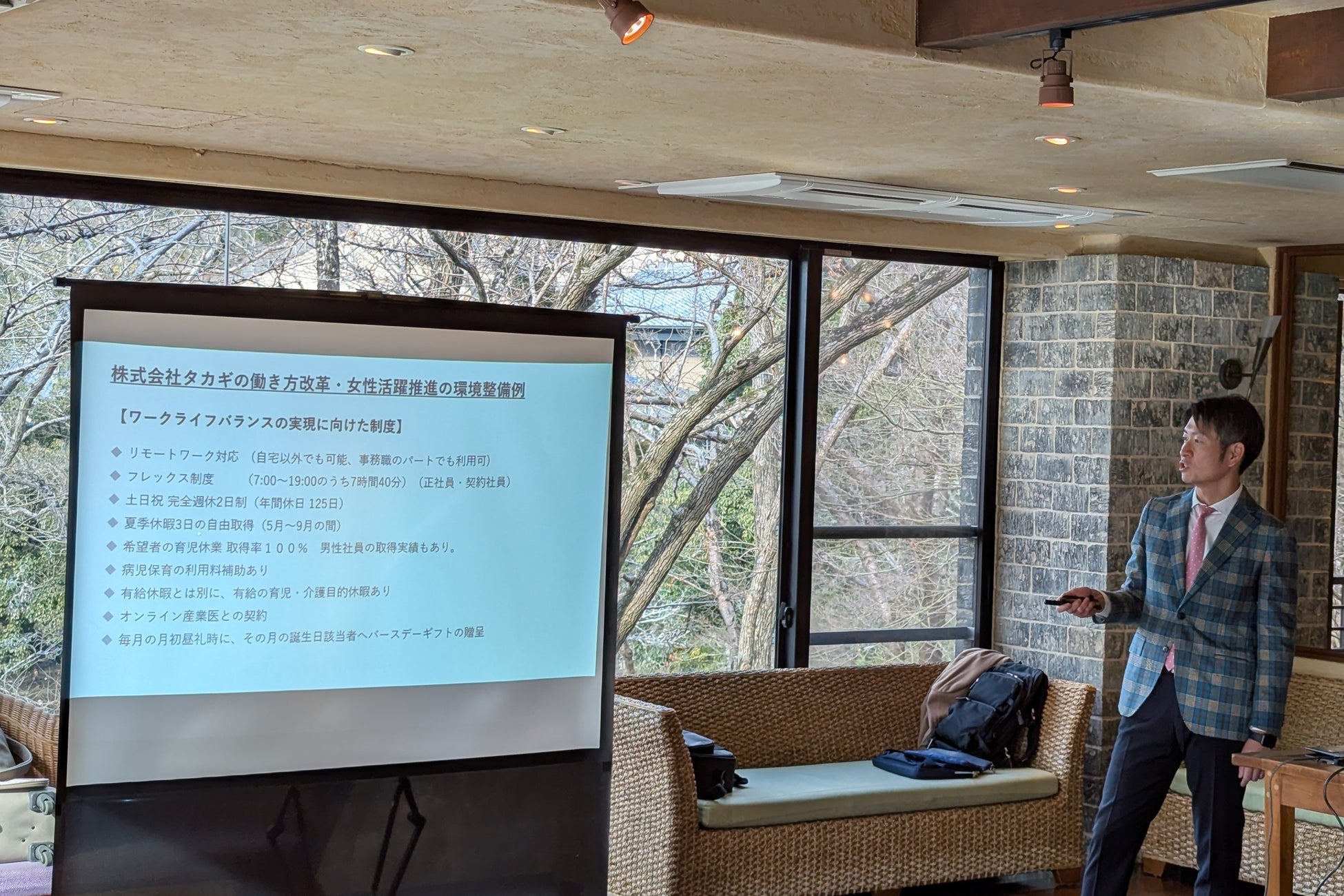 前半は<女性の就業率全国ワースト1>をはじめとする奈良県の雇用状況のデータを用いて、職場環境整備の重要性を説明し、「優秀な人材の雇用と一人ひとりが持続的に活躍できる環境づくり」をテーマに取り組み事例を紹介しました。タカギは多様な社員が働きやすい会社を目指し、リモートワーク・フレックス制度、病児保育の利用補助、オンライン産業医などの制度を導入。仕事と家庭を両立しやすい職場環境の整備によって、若年層の採用を強化し社員の年齢構成比を改善しました。