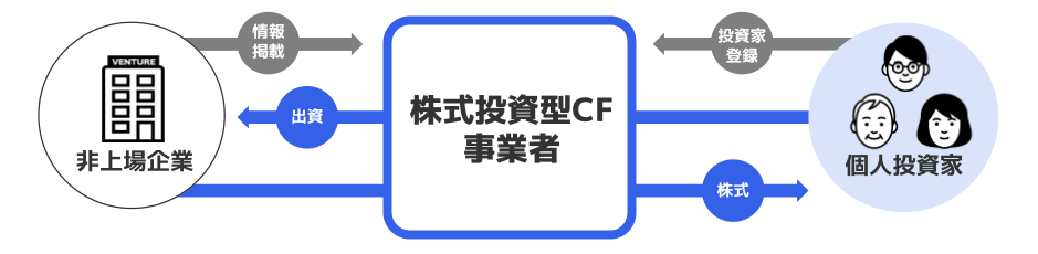 これまで個人投資家が非上場のベンチャー企業に投資できる機会は極めて限定的で、エンジェル投資家と呼ばれる一部の経営者や資産家しか投資を行うことはできませんでしたが、「株式投資型クラウドファンディング」の仕組みにより、個人投資家がベンチャー企業へ投資を行うことが可能になりました。