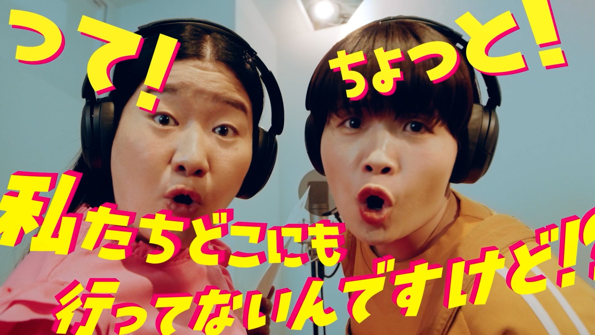 最後に、ナレーションブースでの撮影が行われ、「私たちどこにも行ってないんですけど?」というナレーション通り、海外ロケもないまま、現実世界の“リアルガンバレルーヤ”は予定より大幅に早く撮影を終えました。不思議な撮影を経て、どのようなCMに仕上がったのか?