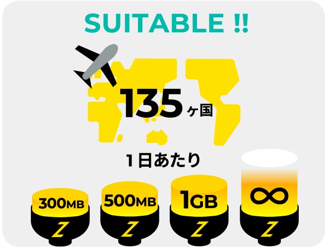 世界135の国と地域に対応し、周遊プランもご用意しています。さらに、1日あたりの容量が「300MB」「500MB」「1GB」「無制限」の4タイプから選べます。 対応国・地域は公式サイト(https://zeuswifi-global.jp/)をご覧ください。