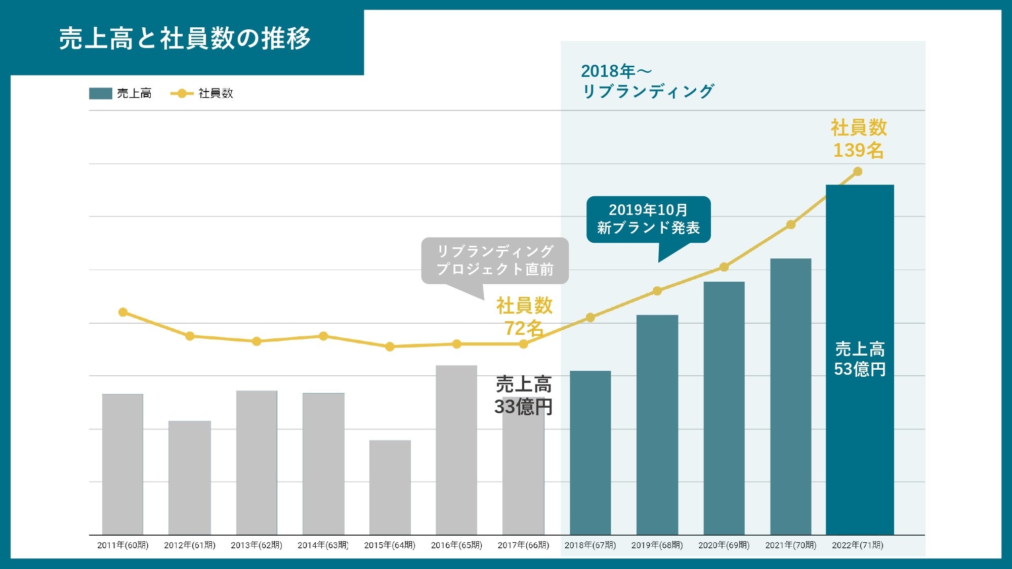 滋賀県を中心に、オフィス・工場・公共施設・土木・住宅や店舗の新築リフォームまで手掛ける総合建設会社です。1950年に創業し、本社は滋賀県で最も過疎高齢化の進む高島市にあります。2015年頃から、売り手市場化に伴う採用難に直面し、他社とは違う職場環境づくりや打ち出し方を意識し始め、2018年の本社オフィスリニューアルに伴い、「リブランディング」を実施。独自の「働きがい創出」や「採用ブランディング」により、社員数を倍増させ、現在年間500人以上の求職者が訪れる企業に成長しました。
