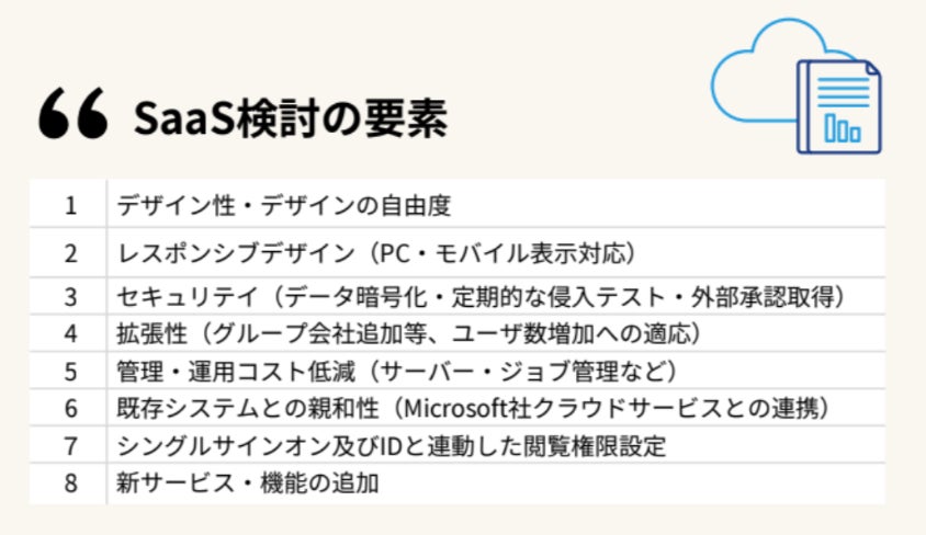 多くのSaaSベンダーの中から最適なサービスを選ぶため、各ベンダーの話を聞き、選定ポイントを比較検討しました。LumApps社は、自由度の高いデザイン設計、グループ会社増加時の拡張対応、既存システムとの連携、シングルサインオンによる簡易アクセスなど、要件を満たす可能性が高いと判断し導入を決定しました。