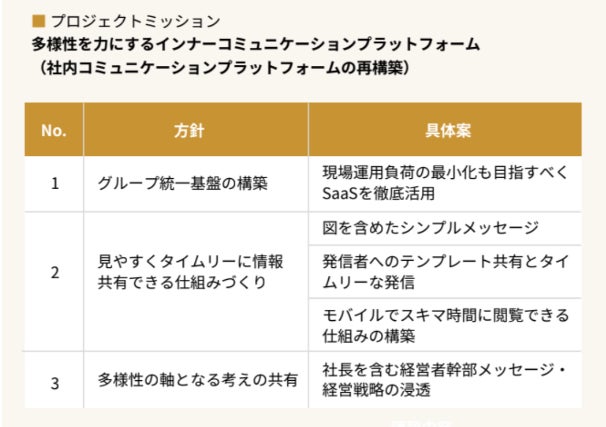 このプロジェクトのミッションは、「多様性を力にする、新コミュニケーションプラットフォームの構築」であり、各事業本部や海外拠点の取り組みや経営幹部のメッセージを迅速に社員に届け、社員による新たな価値創造と企業価値向上を目指すことになりました。