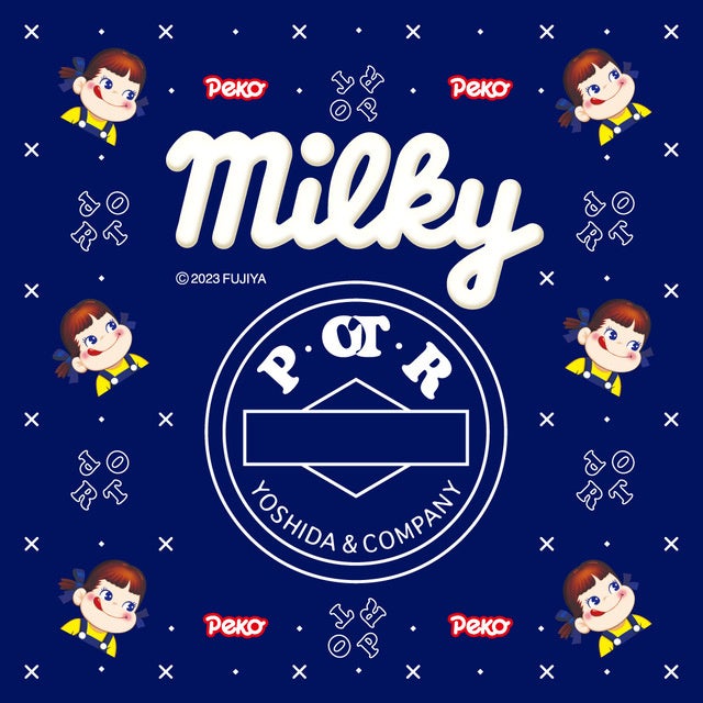 POTRモノグラムに「milky」や「ペコちゃん」を組み合わせたオリジナルデザインを全面にプリント