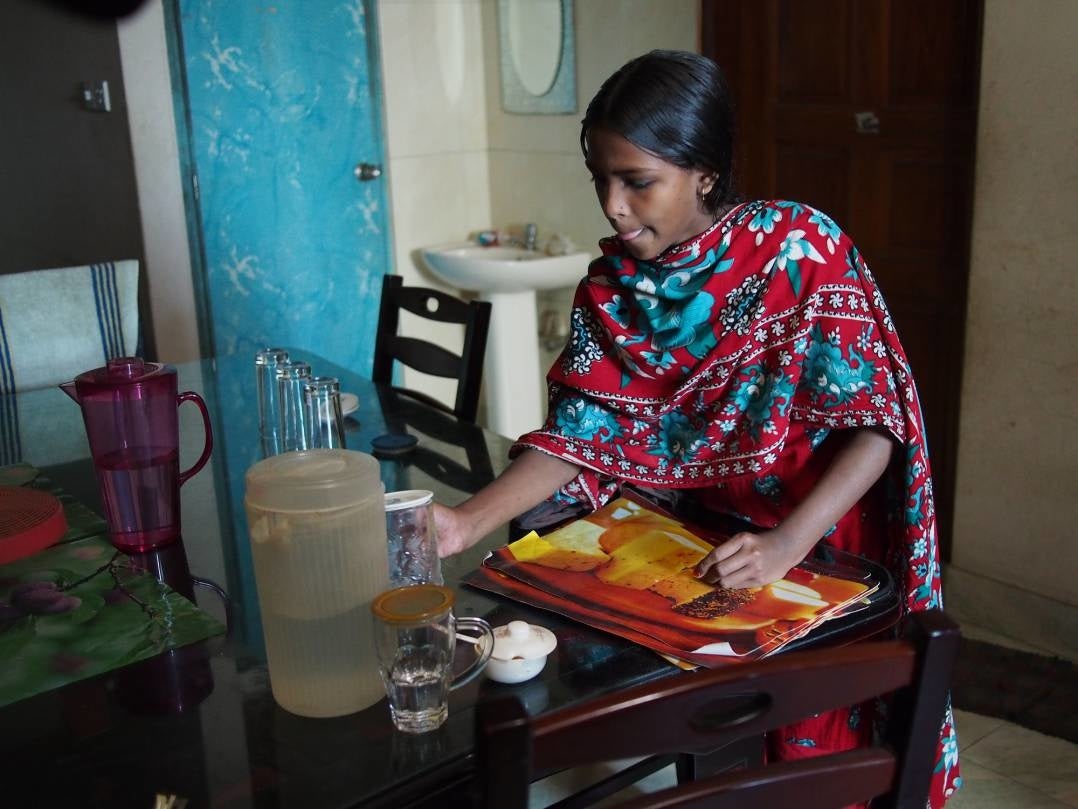 | バングラデシュで家事使用人として働く少女は、外から目が届かない家の中で一日中働き学校にも行くこともできないため、子どもの権利を奪われています。児童労働の問題は、昨年の児童労働撤廃国際年や「外交ボイコット」で焦点となった人権問題などで、近年注目が集まっています。しかし、カカオ・チョコレートなどの食品産業、自動車・電子機器・レアメタルに代表される工業品のような業界団体が存在せず、サプライチェーンのような監視体制が働かないため、児童労働の中でも特に支援が届きにくく改善が進んでいません。工場で働く子どもやストリートチルドレンなどと異なり、家の中で働く少女を発見するのは極めて難しいことから「隠された児童労働」とも言われ、性的虐待にも繋がりやすいため支援の緊急性が高い問題となっています。 |
