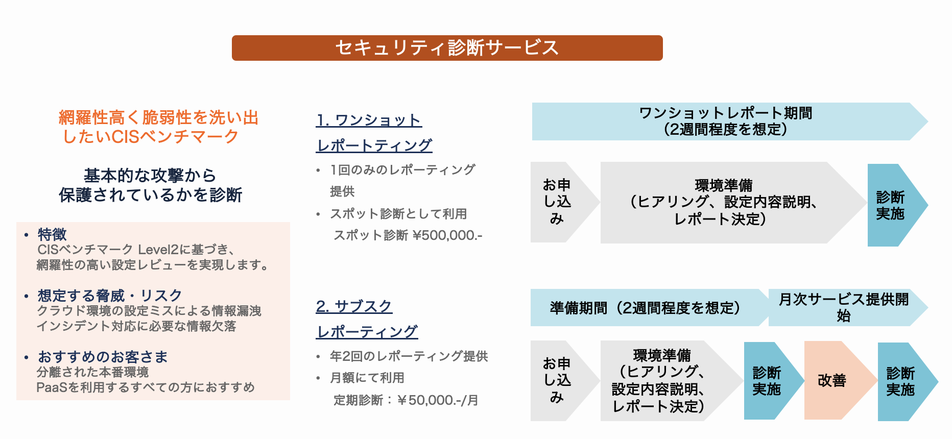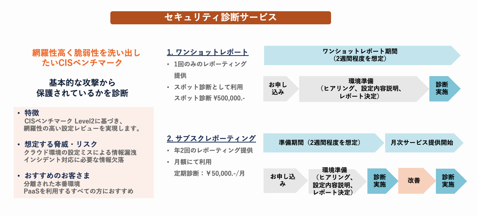 今回ご提供するセキュリティ診断はCISベンチマークに基づき、ネットワーク全体の構成やストレージ設定、暗号化設定など、各クラウドリソースへのアクセス権限やパラメータ設定を分析し、設定不備による脆弱性を検出するとともに是正策を提示します。
