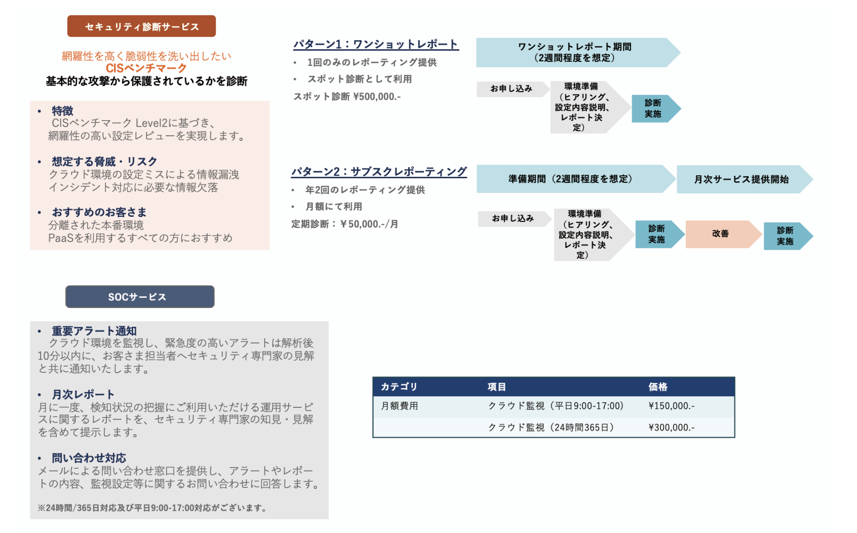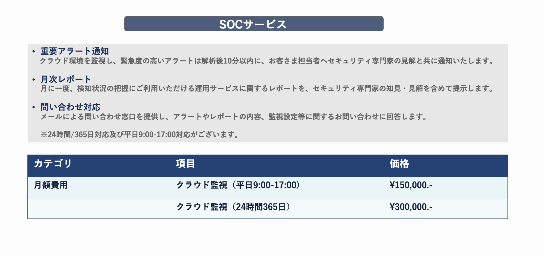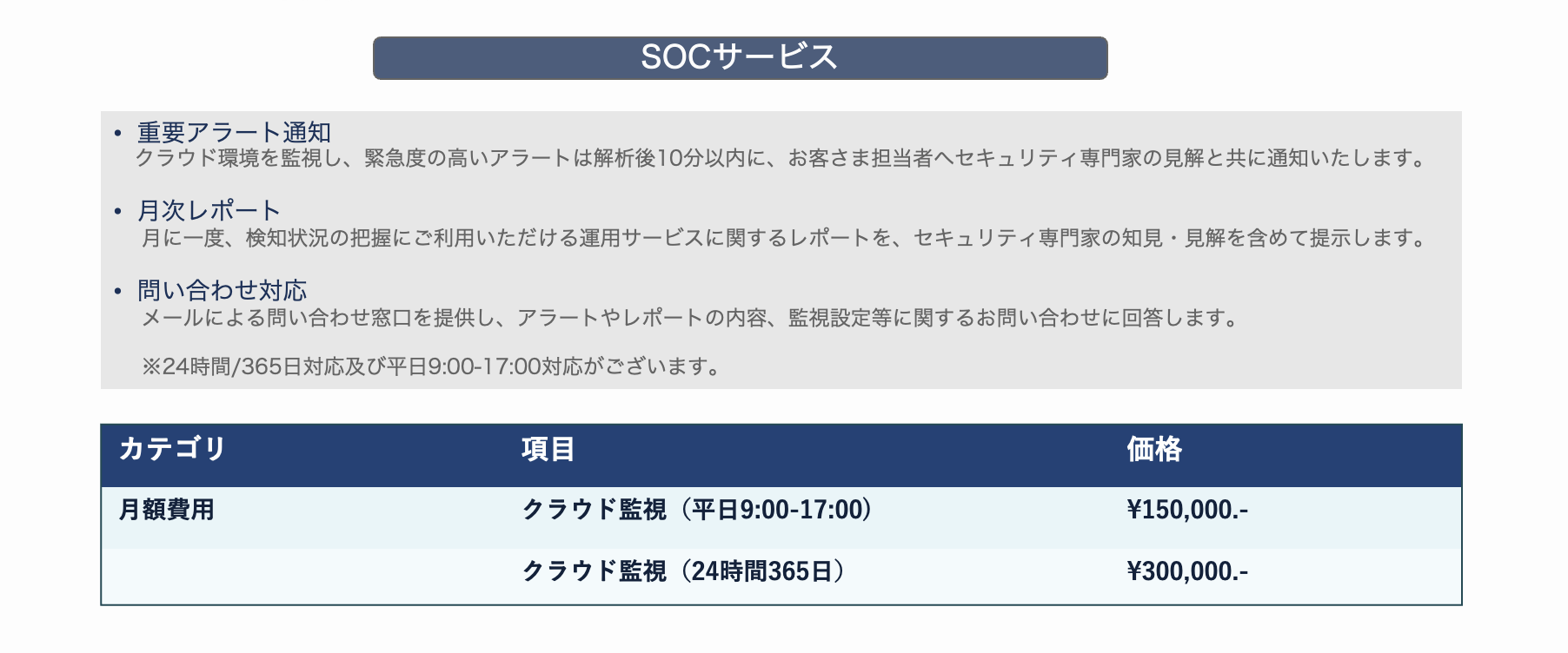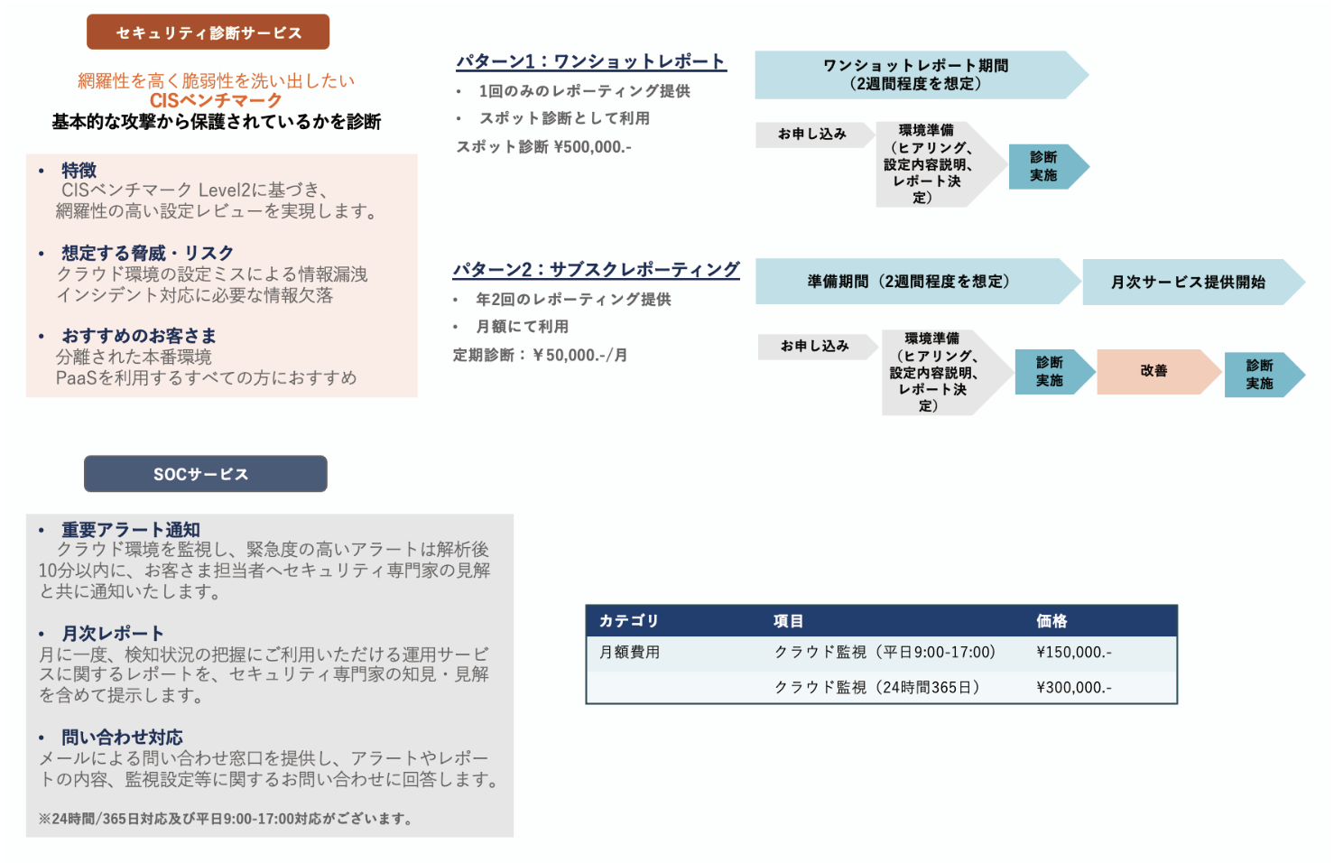 スポットや定期的な診断サービスに加えて、24時間体制を含む監視等を実施するセキュリティ監視サービス(SOCサービス)を提供いたします監視サービスの適用時に検出されるセキュリティリスクを精査し、お客様にとって運用の負荷となる過検知を減らし、お客様環境に合わせた監視設定の作成を行ったうえで、緊急度の高いアラートを解析後10分以内に、お客様担当者へセキュリティ専門家の見解と共に通知するとともに、月に一度、検知状況の把握にご利用いただける運用サービスに関するレポートをセキュリティ専門家による見解をご提示するとともにメールによる問合せ窓口もご提供いたします。セキュリティ監視サービス(SOC)におきましては、株式会社SHIFT(以下、 SHIFT社)との協業によりご提供いたします。SHIFT社が長年積み上げてきたセキュリティ知見をベースに高品質なサービスを提供いたします。