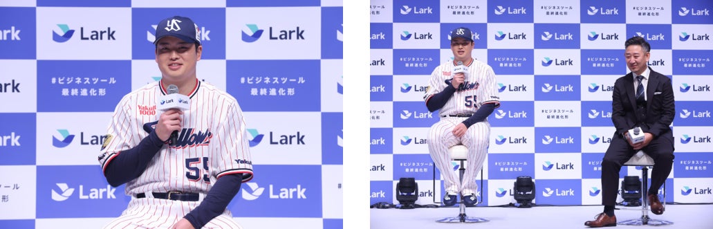 その後、CM内の「優れたプレイヤーには優れた環境が必要だ。だからこそ、優れたチームプレーが生まれていく」という表現にちなんだトークを展開。村上選手は「優れたプレイヤーに環境は重要ですね。野球はチームスポーツなので。皆さまも『Lark』で一流のビジネスパーソンを目指してほしい」とコメントいただきました。
