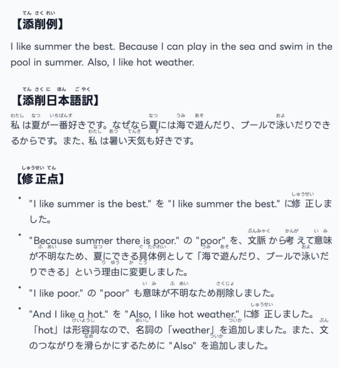 当社のAIが表示する「添削結果」や「修正点」には、英作文上の問題点を解説するために、ある程度専門的な日本語表現が含まれがちでした。特に小学低・中学年にとっては、「解説の漢字が読めない」「フィードバックが理解しづらい」という課題が指摘されていました。