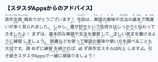 スタディスタジオ株式会社(本社:東京都渋谷区、代表取締役 鈴木孝一、以下「当社」)は、英検®受験生向けWebサービス「スタスタApps」において、新たに意見論述問題の添削結果に“ルビ(振りがな)”を付与する機能を2025年2月5日よりリリースいたしました。近年は小学生でも英検®3級・準2級・2級を目標にするケースが増え、当社のAIライティング添削を活用するユーザーの年齢層が広がっています。しかし、解説本文に難読漢字が含まれることが多く、「せっかくのフィードバックを一部読めない」という声が寄せられていました。今回のアップデートで小学生でも漢字をスムーズに読み解き、“英作文力”向上につなげやすくなります。