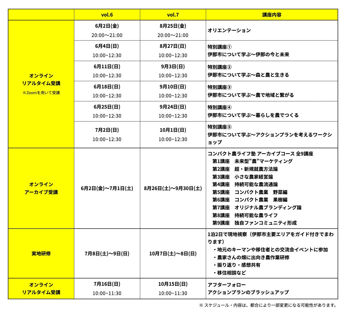 プログラムはオンライン講座を基本としており、第6期では6月2日(金)から7月16日(日)の1.5ヶ月という短い期間で移住・半移住×農ライフを実現することが可能です。長野県伊那市との提携により、伊那市での農のある暮らしを実地研修で体感し、移住に向けたサポートを受けることもできます。受講をご検討の方向けに4月9日(日)より「無料オンライン説明会」「卒業生との座談会&移住相談会」(https://inasta6.peatix.com/)を実施します。