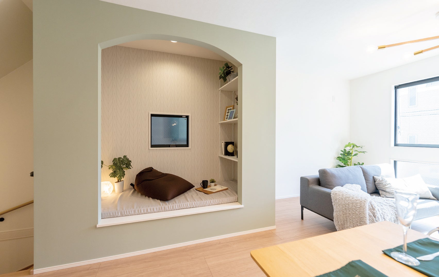 家族の気配を感じながら個の時間を過ごすことができる、リビング内の小上がりリラックス空間。家事の合間の休憩やお昼寝にはもちろん、読書をしたり、ノートパソコンを使ってリモートワークをしたり、生活スタイルに合わせて様々な使い方が可能です。