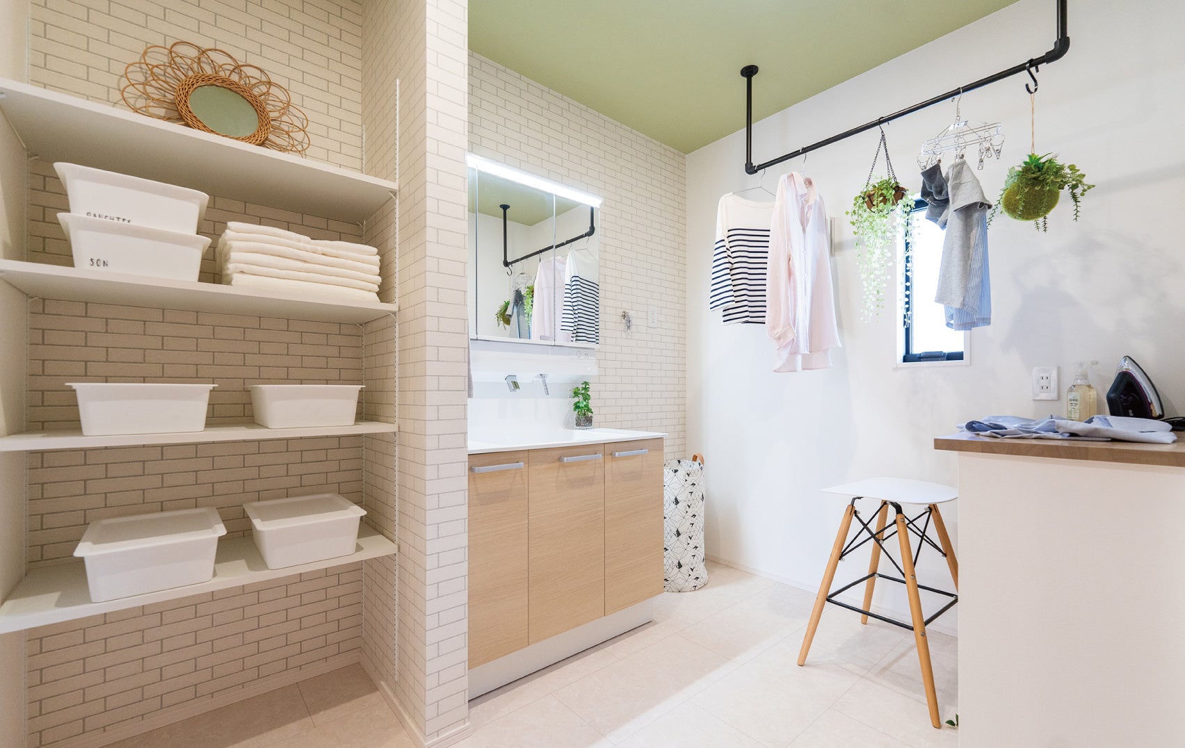 カウンターとランドリーパイプを設け、洗う→干す→たたむが一カ所で完結する洗面脱衣室はハウセットの自信作。面倒な家事のうちの一つである洗濯の時短に繋がります。忙しいご家庭でもストレスのない暮らしを。
