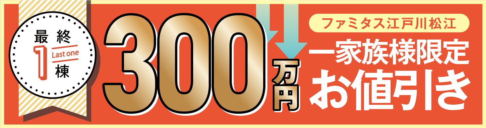部屋数の多さ、家事動線や採光にも配慮されたモデルハウスとして多くの方にご覧いただいていること、また、本物件のみならず弊社他物件も好調であることから、感謝の気持ちを込め『ファミタス江戸川松江』7号棟をご成約の一家族様に限り300万円のお値引きという形で利益を還元させていただきます。