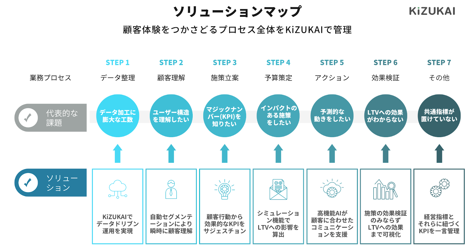 データを活用し、顧客体験を高め収益向上を実現することは多くの企業で課題となっています。しかし、実際にはデータ分析に基づく施策ではなく、勘や経験に頼った仮説検証・施策運営が行われています。KiZUKAIはそのような企業に寄り添い、専門的なスキルがなくてもデータ分析を可能にすることで、顧客ニーズに合わせた施策運営、更には顧客体験・収益の向上に向け伴走していくことが出来ます。