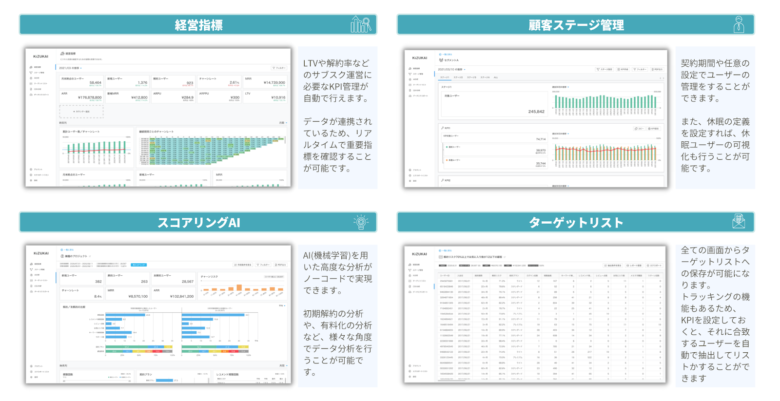 経営指標や顧客ステージの可視化にはじまり、AIスコアリングによる示唆提供、その後のアクションに繋がる支援機能を搭載、良質でシームレスな一連の顧客体験を管理することにより、収益に繋げるためのPDCAが可能となります。