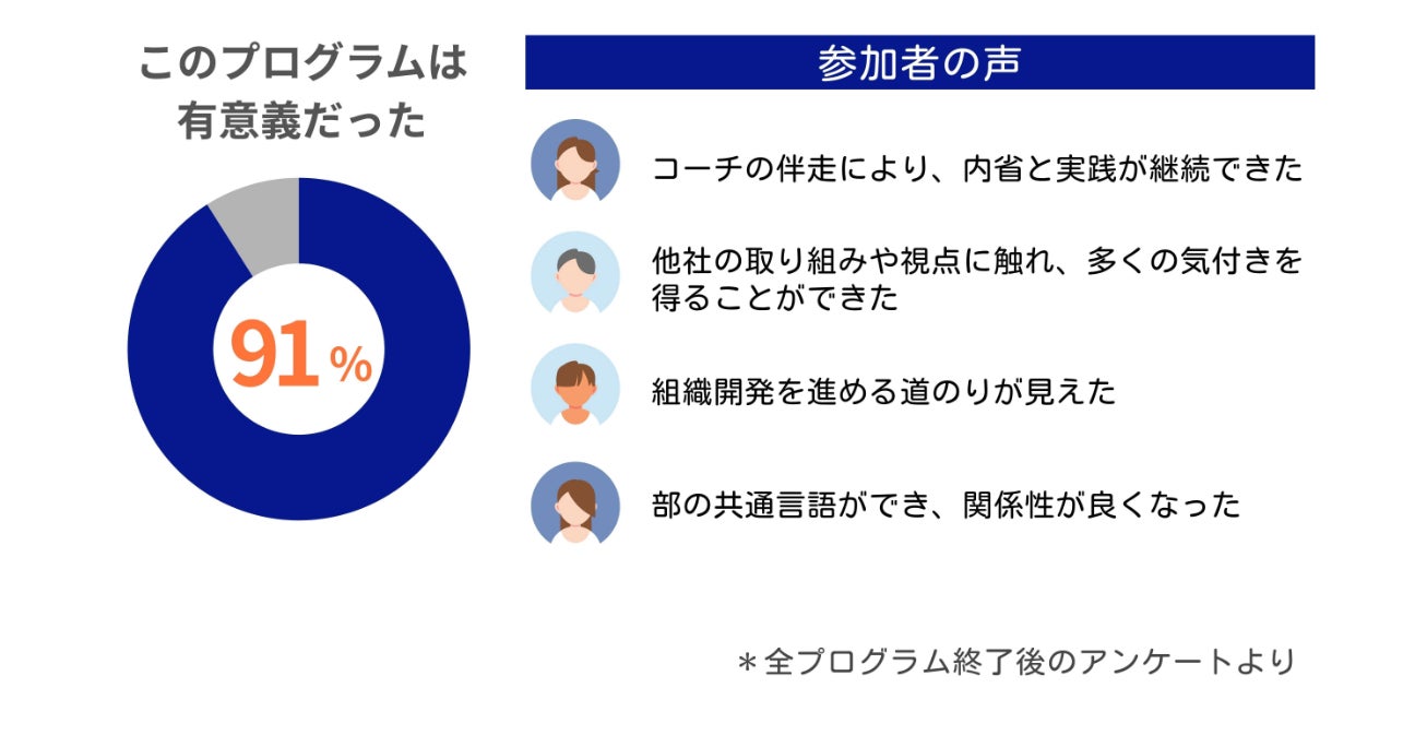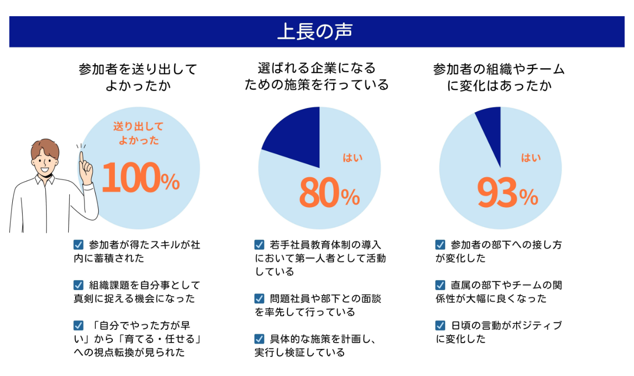 昨年度の実施では参加者の有意義度91%、上司満足度93%という高い評価を得ており、現場に具体的な変化を創出してきました。