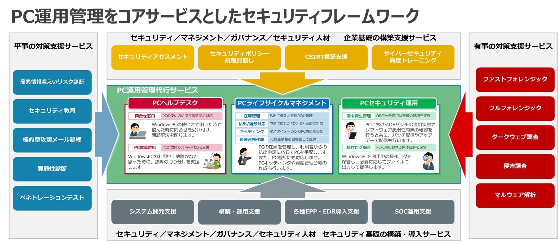 万が一サイバー攻撃事故に見舞われた際も、「有事におけるデジタルフォレンジックやダークウェブ調査」の支援など、SOCベンダーだから実現できる「PC運用管理代行サービス」として提供します。
