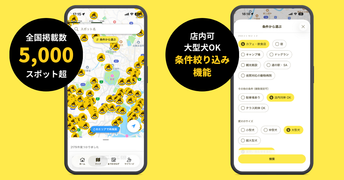 さらに 「店内OK」「大型犬可」など細かい条件検索にも対応しているので、愛犬とのにぴったりのスポットを見つけることが可能です。