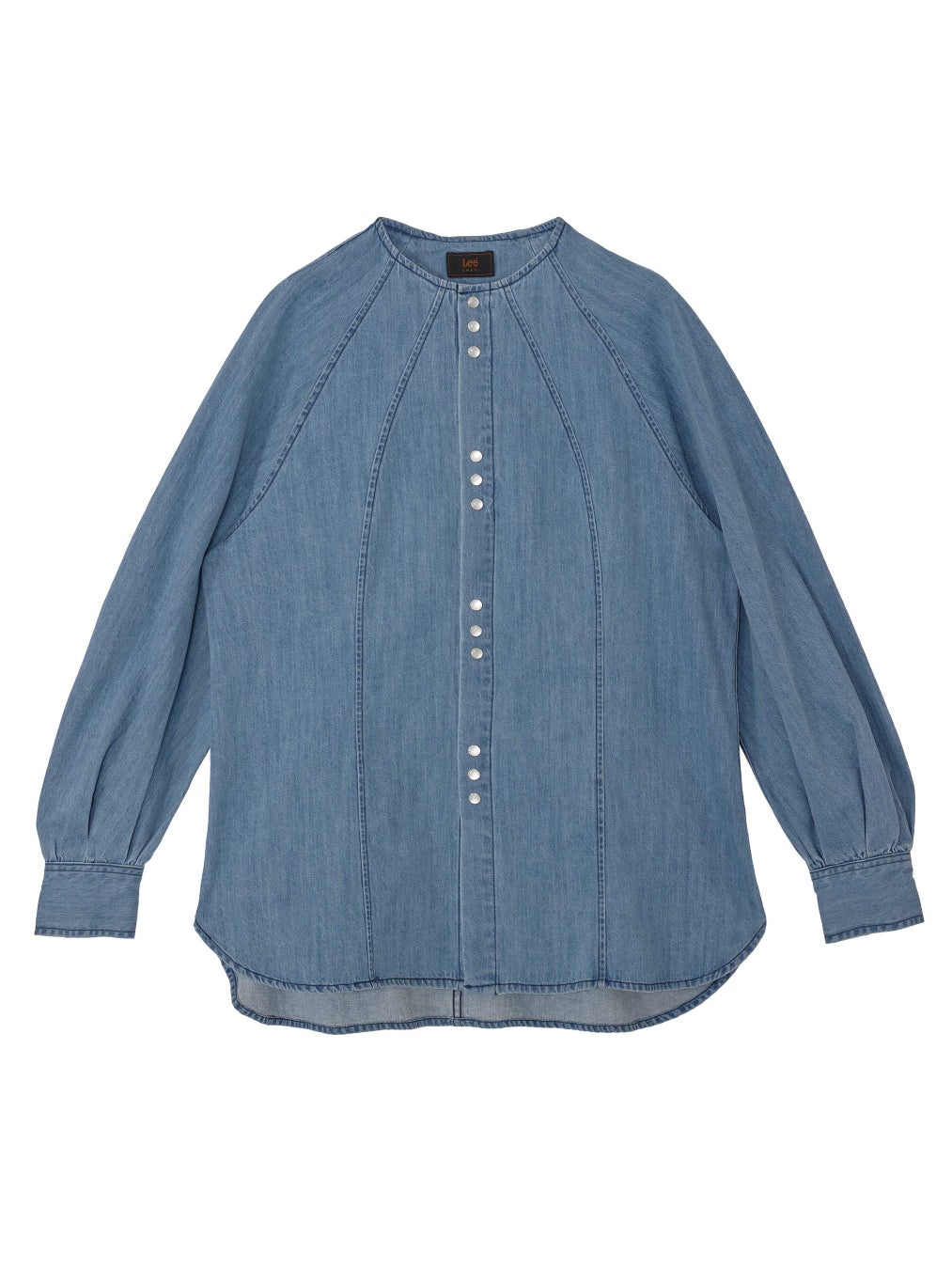 モードなデザインをプラスしたデニムシャツ。3つの連なった釦デザインやカーブを描いたアームホール、丸みのある袖などAMERIらしくモードな要素を詰め込んだアイテムです。Leeのウエスタンシャツでも使用しているシャツ用デニム素材を使用し、軽やかな素材で加工の風合いも良い生地です。