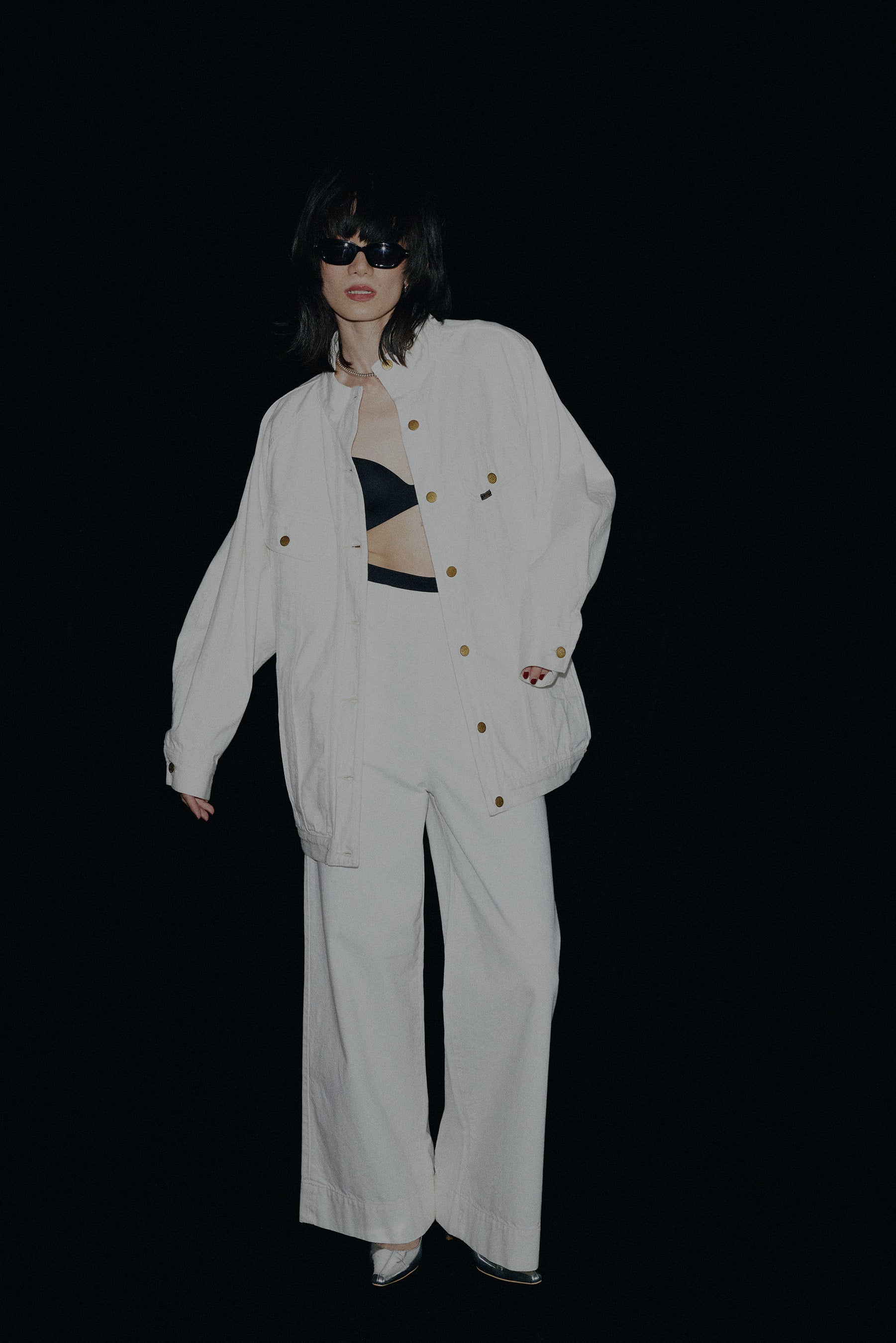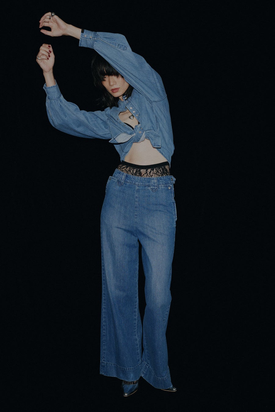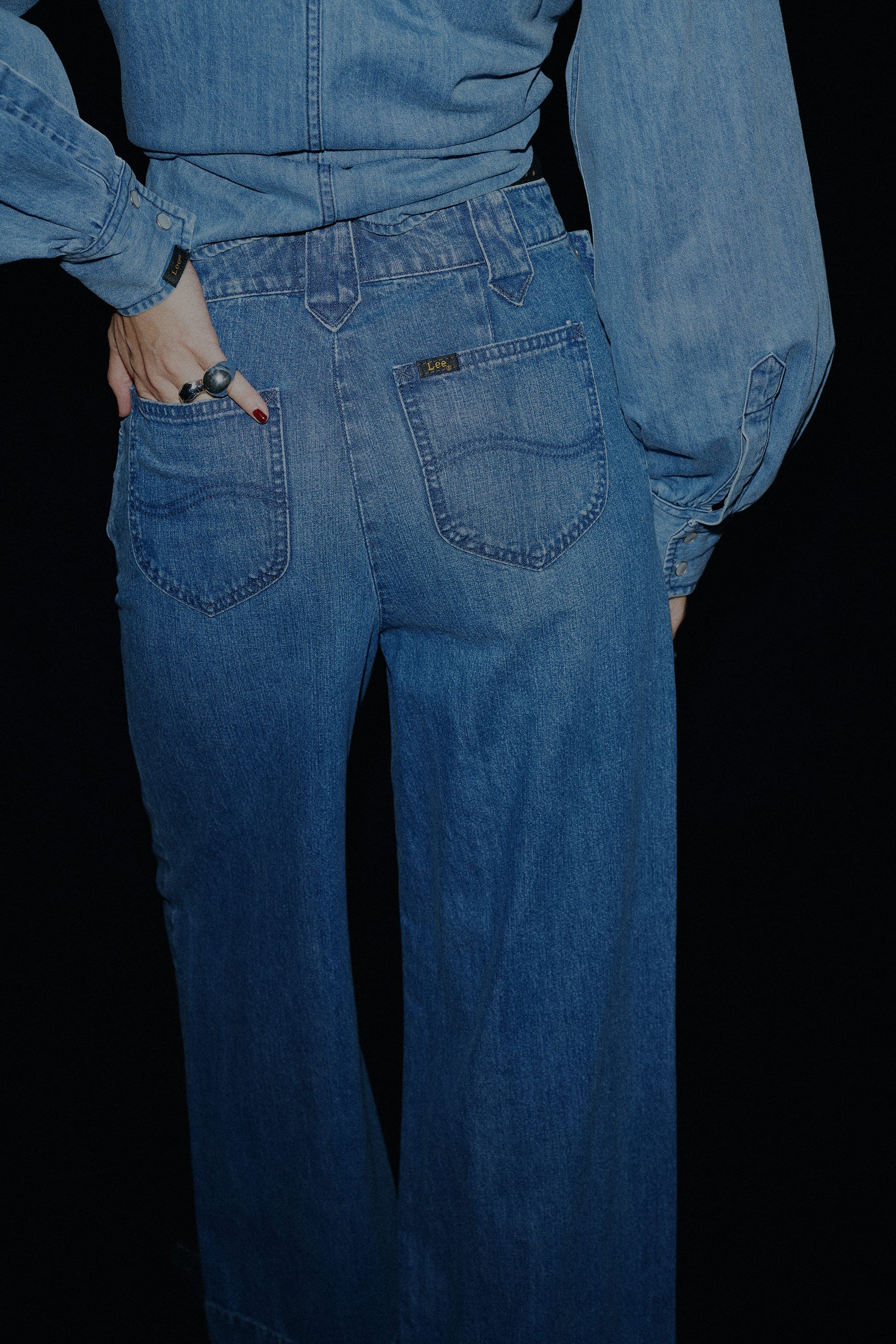ポケット口の付属使いやベルトループの形が可愛いLeeオリジナルのバギーフレアパンツをグレーディング。ウエストをAMERIのサイズ感し、股下を長めに仕上げアレンジしました。後ろポケットに付いたモノトーンのAMERIコラボのフラッシャーもポイント。素材はLee オリジナルのジェルトデニムを使用し、軽さと強度を兼ね備えたワークウェアならではのデニムです。