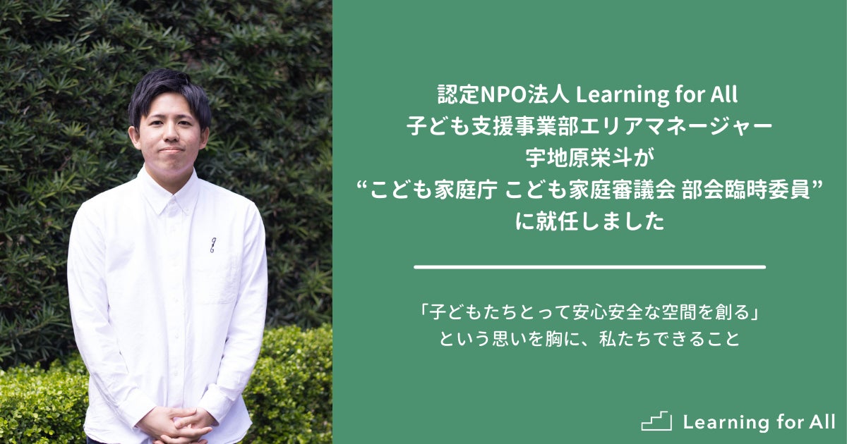 認定NPO法人 Learning for All 子ども支援事業部エリアマネージャー 宇地原栄斗が内閣府が4月1日に新設した“こども家庭庁 こども家庭審議会 部会臨時委員”に就任しました