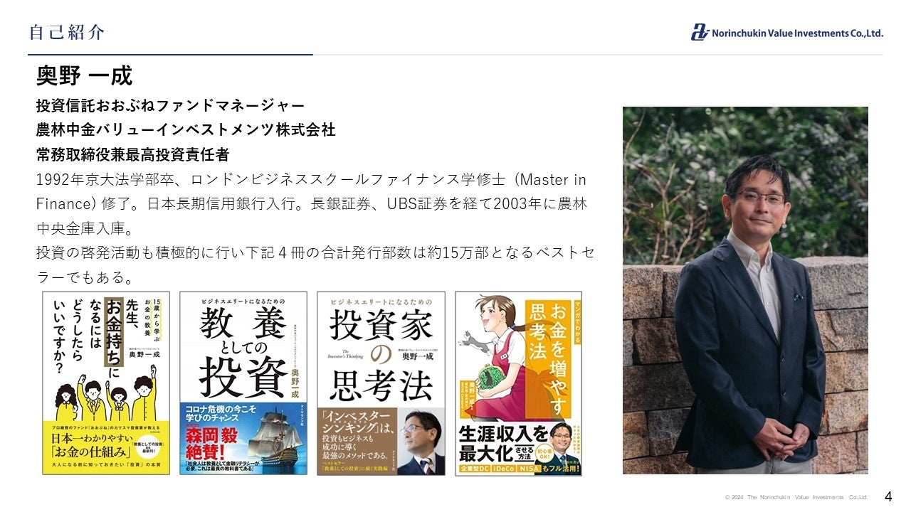 農林中金バリューインベストメンツ(金融商品取引業者 関東財務局長(金商)第 2811 号 一般社団法人日本投資顧問業協会加入 一般社団法人投資信託協会加入)は、農林中金グループの一員として投資運用業を行っています。長期厳選投資の国内におけるパイオニアであり、2007年に農林中央金庫株式投資部にて長期厳選投資のための専担チームとしてスタートして以来、短期的な売り買いをする投資ではなく長期的に企業の株式を保有し続ける長期投資(売らない投資)を貫徹。2010年に機関投資家向けファンドに対する投資助言を開始して以降、米国株投資、投資教育への取組み等、投資の世界を変えるべく様々なチャレンジを行ってきており、2017年からは、個人向け投資信託の運用・助言をスタートしました。弊社が投資助言を行う「農林中金<パートナーズ>長期厳選投資 おおぶね」の各種受賞歴は以下のとおり。