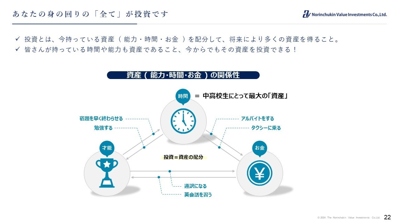 投資や金融の知識を備えた次世代人材を育成し、未来を見据えて「価値を理解し、かつ自ら価値を創造することを意識して行動できる次世代の人材」を育てていくことが、長期的に見て企業だけでなく社会全体の価値の増大につながっていくものであると考えています。