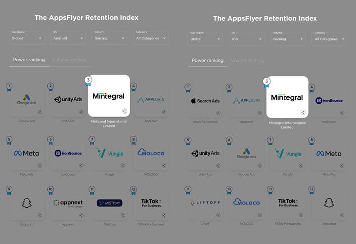 iOSの細分化カテゴリーのゲームリテンションインデックスでは、Mintegralは長期的に積み上げてきたハイパーカジュアルゲームカテゴリーにおいて優勢で、ハイパーカジュアルゲームの規模では第3位を獲得しました。また、ミッドコーアゲームとカジュアルゲームに関して、Mintegralは他プラットフォームよりも明らかに優位性を持ち、2つの副区分カテゴリーのゲームトラックにおいては実力と規模ともに第2位に位置しており、「質」と「量」の両面で良好な実績を残しています。さらに、ユーザーが品質を最も重要視するハードコーアゲームに関しても、実力チャート第2位、規模においてはASAとMeta Adsに次ぎ、第3位を確保しています。