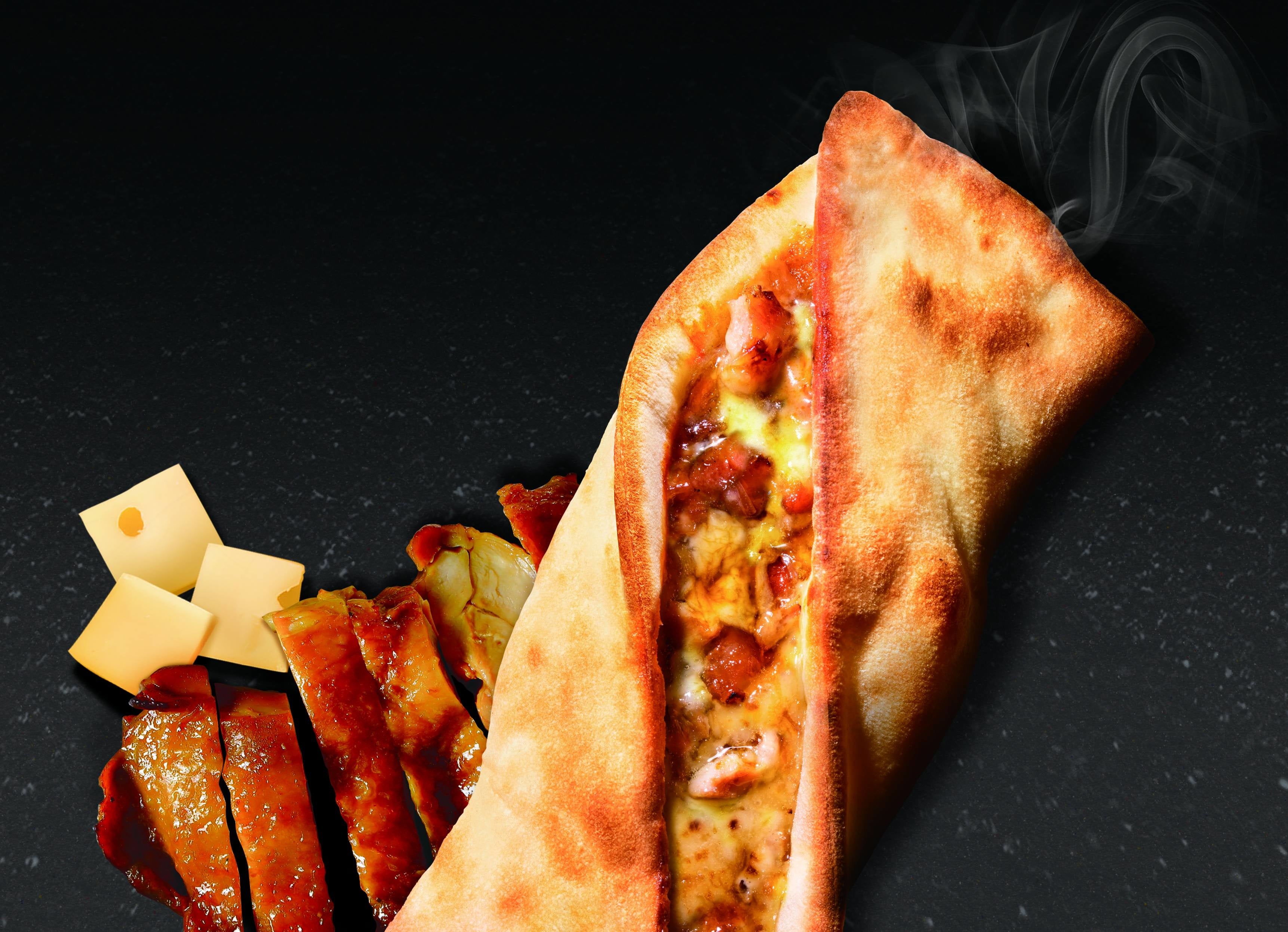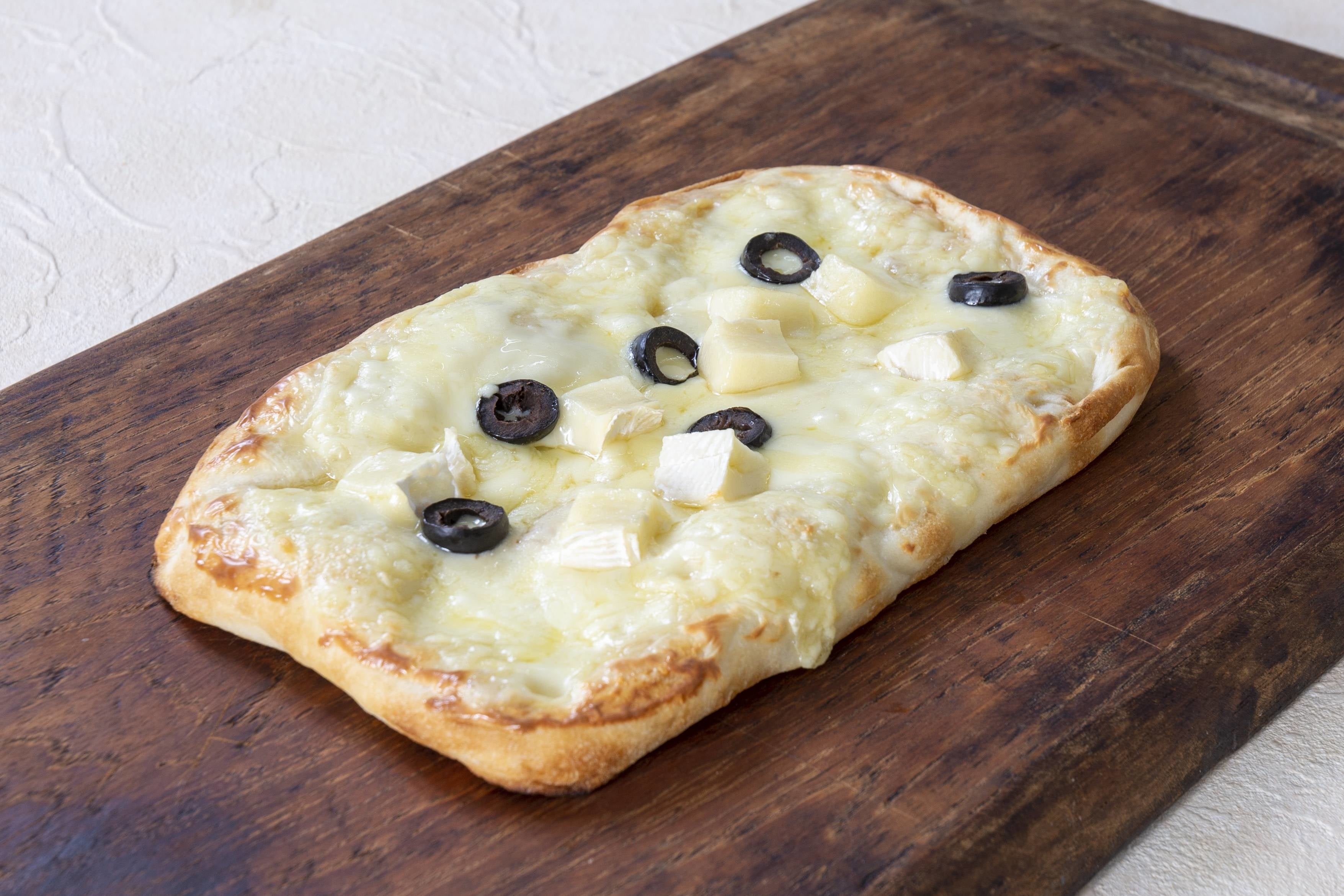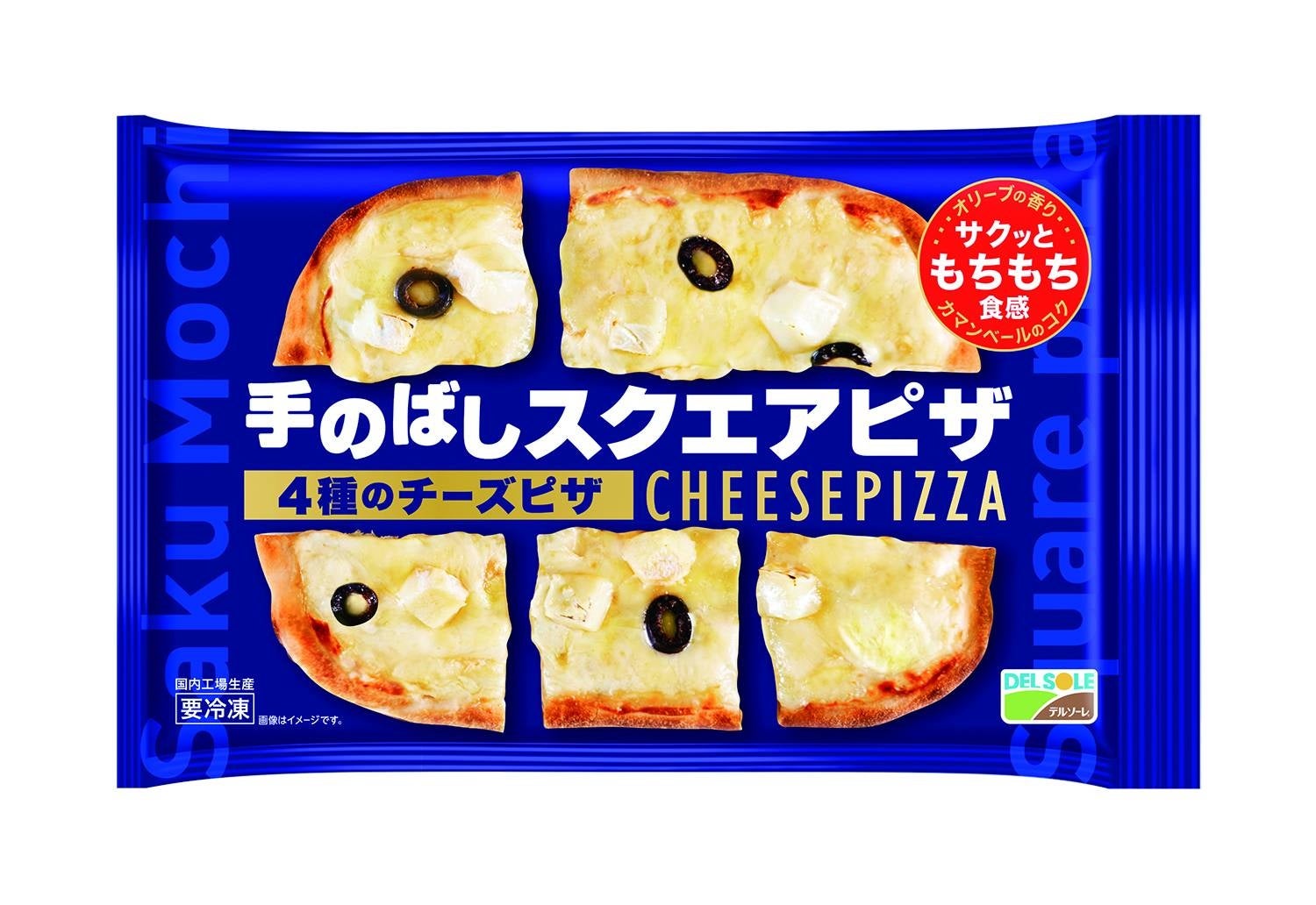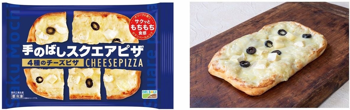ロングセラー商品の「手のばしナン」と同様な製法で一つ一つ丁寧に手で伸ばすことで実現したもちもち食感の生地にカマンベール、ゴーダ、ステッペン、グラナ・パダーノ、ブラックオリーブをトッピングしたスクエアピザ。