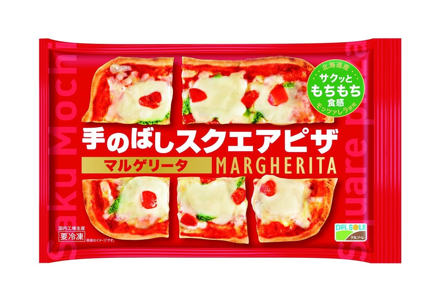 ロングセラー商品の「手のばしナン」と同様な製法で一つ一つ丁寧に手で伸ばすことで実現したもちもち食感の生地にトマトソース、北海道モッツァレラチーズ、トマト、バジルペーストをトッピングしたスクエアピザ