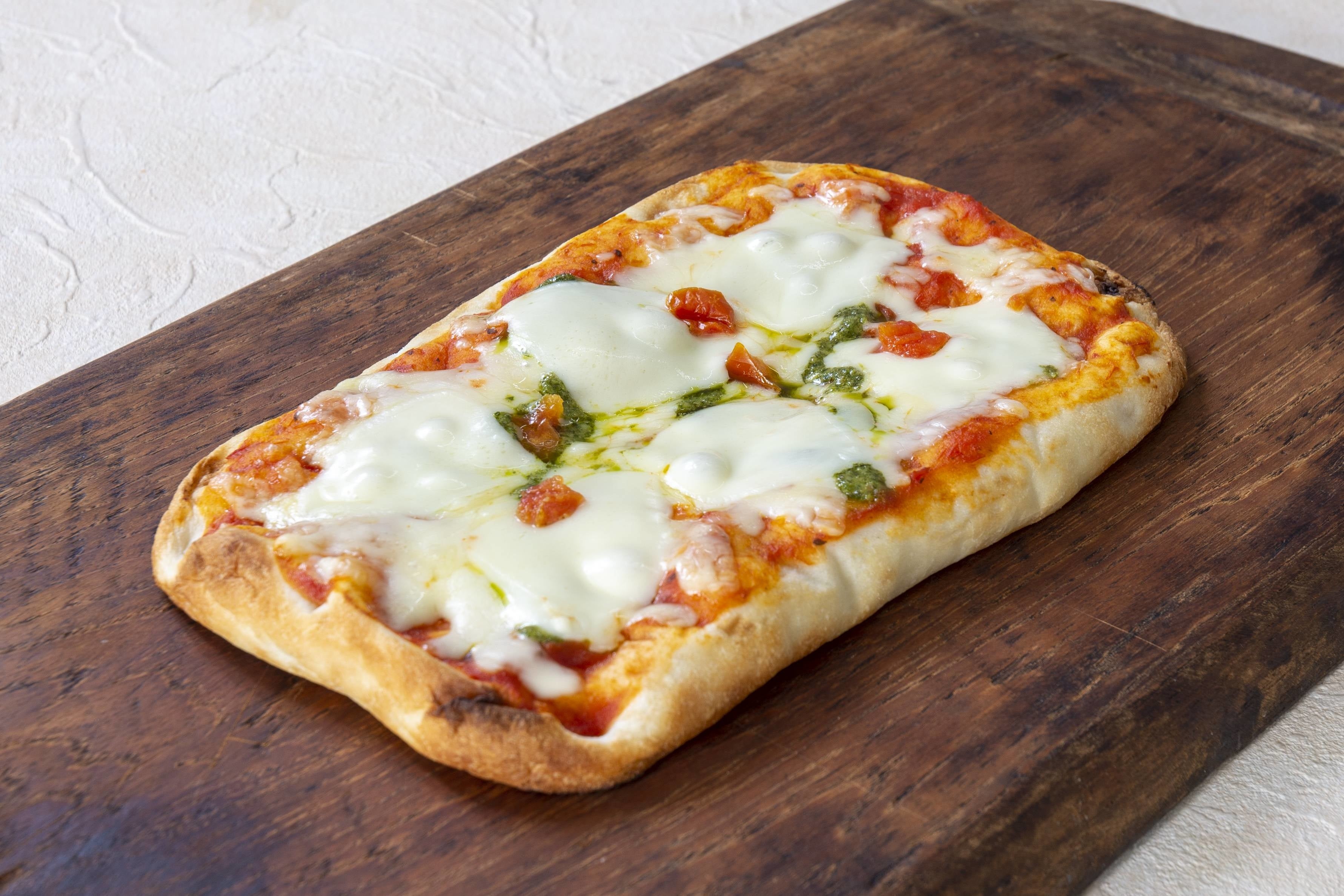 発酵種を使用した生地にトマトソース、チーズ、オレガノをトッピング。もちもち食感に焼き上げました。