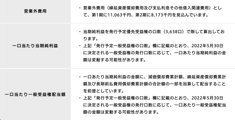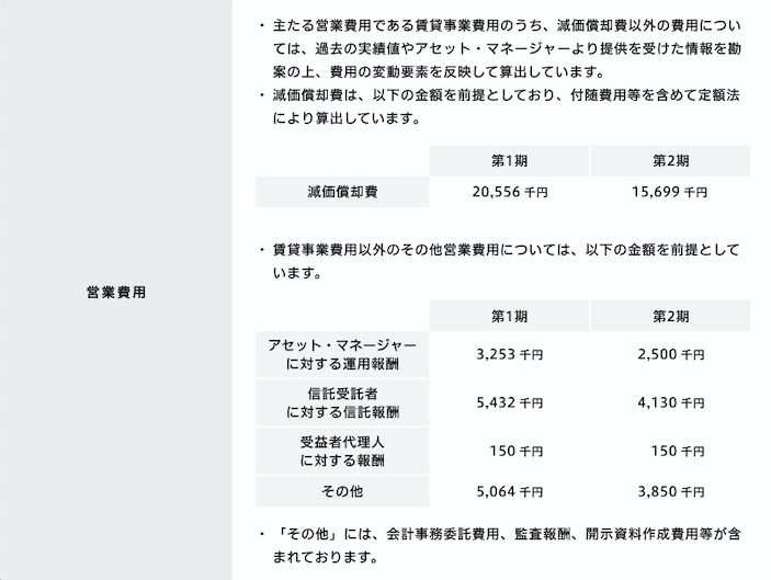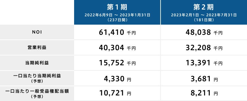 本資料に記載されている予想数値は、一定の前提条件のもとに算出した現時点の見込額であり、今後の賃料収入の変動、予期せぬ修繕の発生等運用環境の変化、又は金利の変動等状況の変化により、前提条件との間に差異が生じ、その結果、当期純利益及び1口当たり一般受益権配当額を含む予想数値は変動する可能性があります。本資料は、その金額を保証するものではありません。
