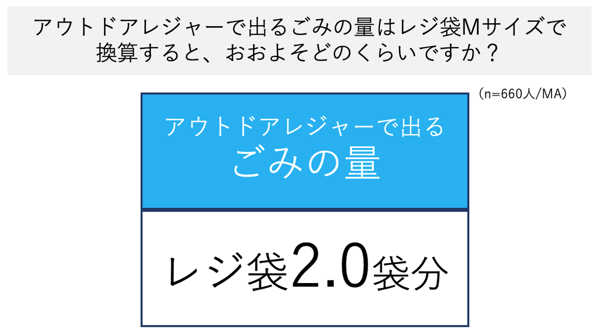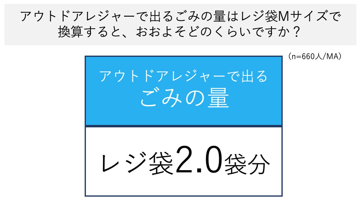 ・アウトドアレジャーで出るごみの種類第一位「ペットボトル」、第二位「菓子などのプラスチック製の袋」、第三位「割り箸」。ペットボトルのごみと回答したのは64.2%。ごみの量については、64.4%がレジ袋Mサイズ1〜2袋と回答。平均すると、1人あたり「2袋分」のごみが出ていることが判明。