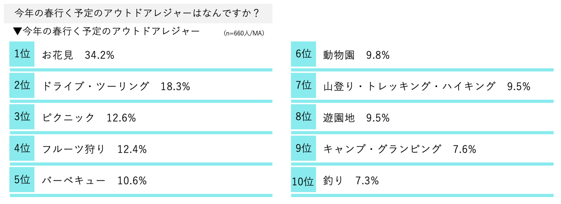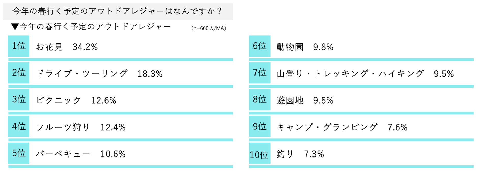 ・この春アウトドアレジャーに行く予定の人は55.3%。今年の人気レジャー第一位は「お花見」、第二位「ドライブ・ツーリング」、第三位は「ピクニック」や「フルーツ狩り」。