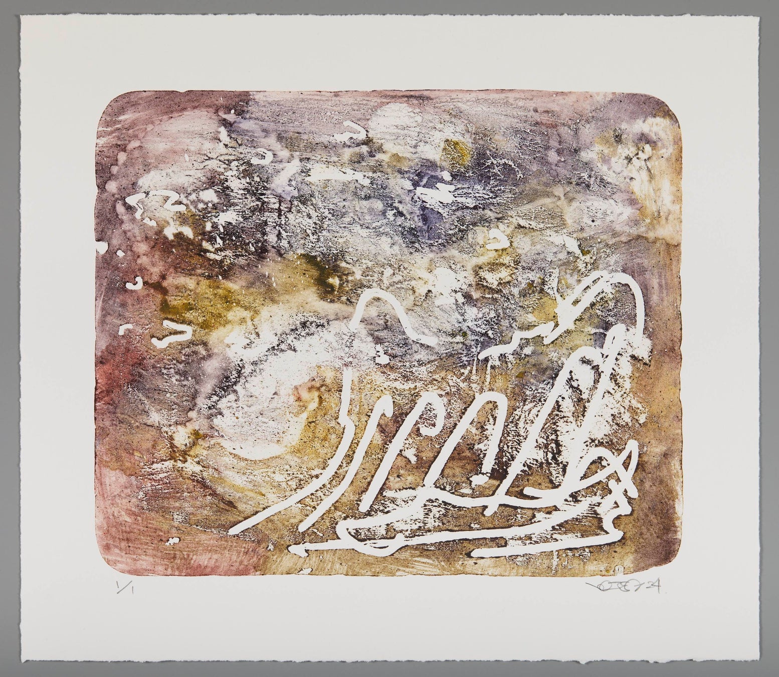そのような、自らではコントロールしきれない現象を作品に生かしたことで、同じ版でもすべてのプリントの表情が違う、版画作品でありながらそれぞれがオリジナルとなる、モノタイプと呼ばれる作品群が完成した。 ドローイングの周りにある色たちが、石板のうえで起きたこの世界の自然の現象のようなものだとしたら、それを避けるようにして見えてくるドローイングは、人類が獲得したイメージという他にないパラレルなもう一つの世界である。